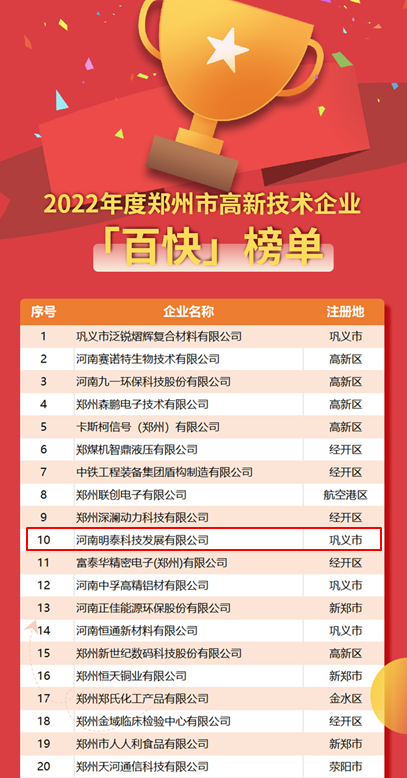 12月29日,鄭州市科學技術情報研究所發(fā)布2022年度鄭州市高新技術企業(yè)“雙百”榜單,集團子公司河南明泰科技發(fā)展有限公司作為“老牌”國家高新技術企業(yè)榮登榜單。